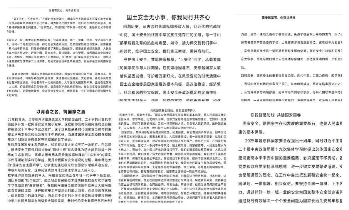 公司举办了“国家安全,你我同行”征文活动,鼓励员工们结合自身学习和生活实际,抒发对国家安全的认识和感悟。活动得到了广大员工的积极响应,共收到征文30余篇。员工从不同角度阐述了对国家安全的理解,有的同学聚焦康复领域的生物安全,探讨在医疗过程中,如何防止病菌传播、保障患者和医护人员的健康安全;有的同学则着眼于文化安全,强调在医学文化传承与交流中,要坚守本土优秀文化,防止文化入侵。经公司专业员工的认真评选,共评选出6篇优秀征文,进一步扩大了活动的影响力,激发了员工们维护国家安全的热情。