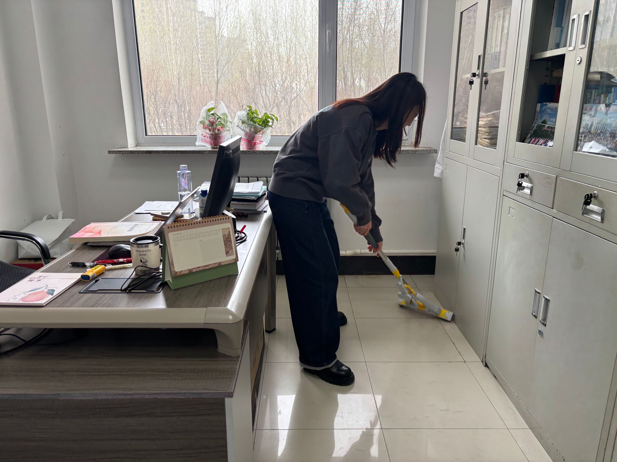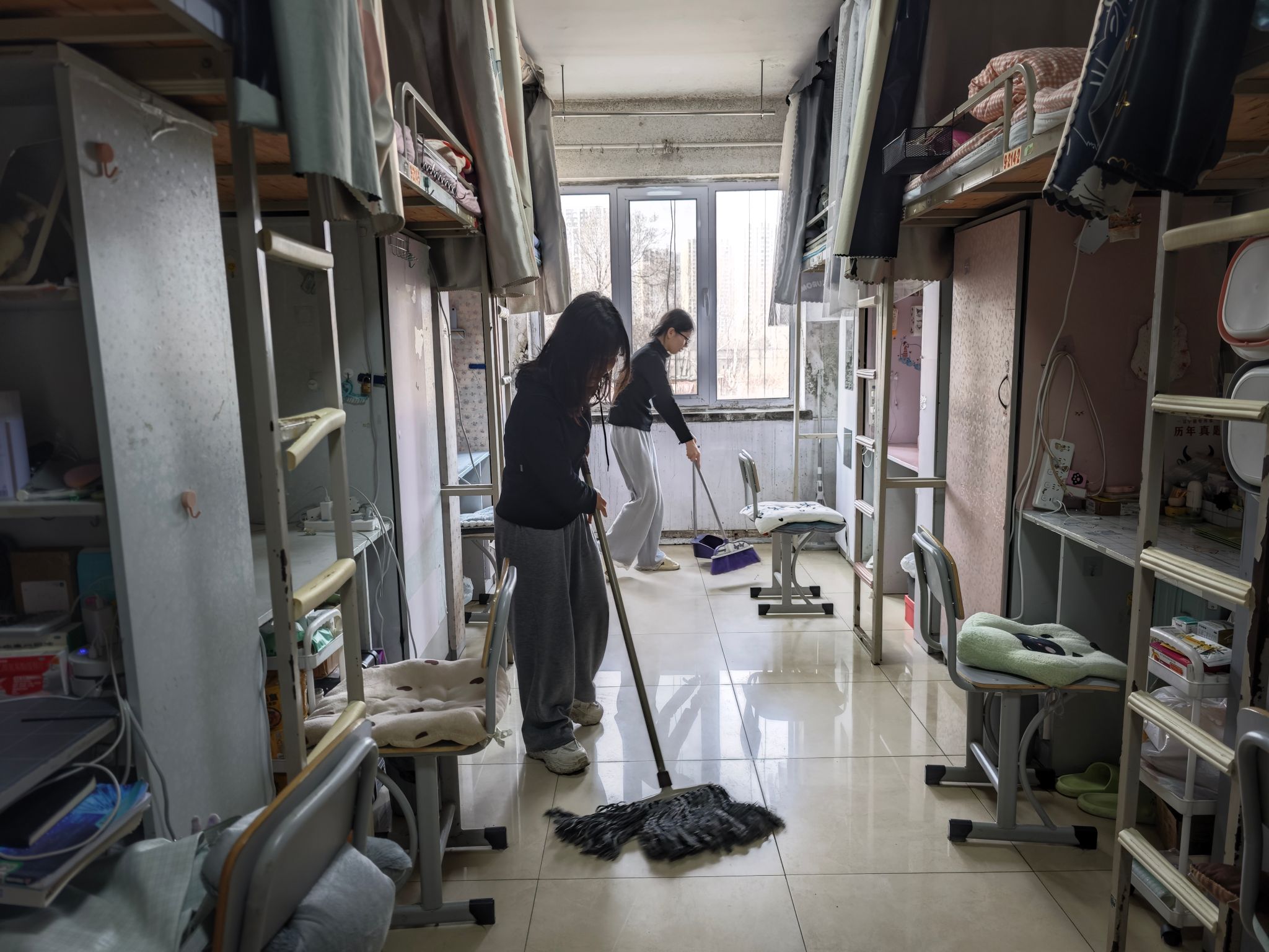 在辅导员的协调下,员工分工协作,整体环境得到极大改善。员工积极参与寝室清洁工作,清扫过程中,认真擦拭门窗、地面,清理墙角积尘;床铺整理严格按照标准执行,做到被褥叠放整齐、物品摆放有序。严格遵循“四无标准”,全面清除室内异味,清理杂物堆积。