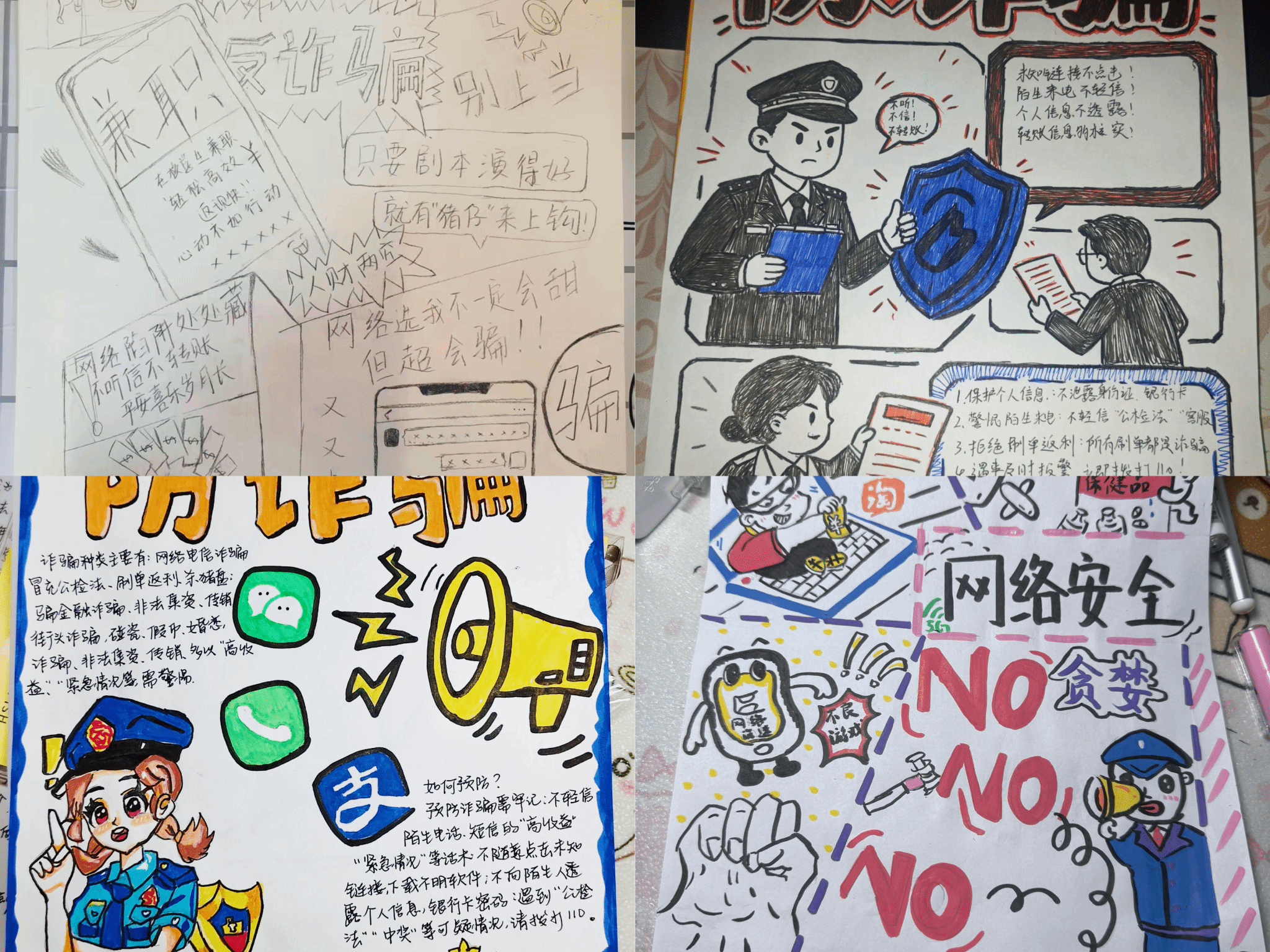 参赛作品形式多样、创意十足,兼具思想性与艺术性。有的作品以“反诈盾牌”“网络陷阱”为具象化表达,直观展现刷单返利、冒充公检法、非法集资、婚恋诈骗等常见网络诈骗套路;有的作品以“执笔护网”“青春与网安同行”为情感内核,用写意笔触传递青年学子守护网络安全的决心;还有的作品融入实用反诈提醒,清晰标注“陌生来电不轻信、个人信息不透露、未知链接不点击”等核心要点,让宣传画兼具教育性与实用性。一幅幅作品将枯燥的网络安全条文转化为可感可见的艺术画面,精准贴合青年员工的认知特点与审美偏好,让网络安全知识入眼、入脑、入心。