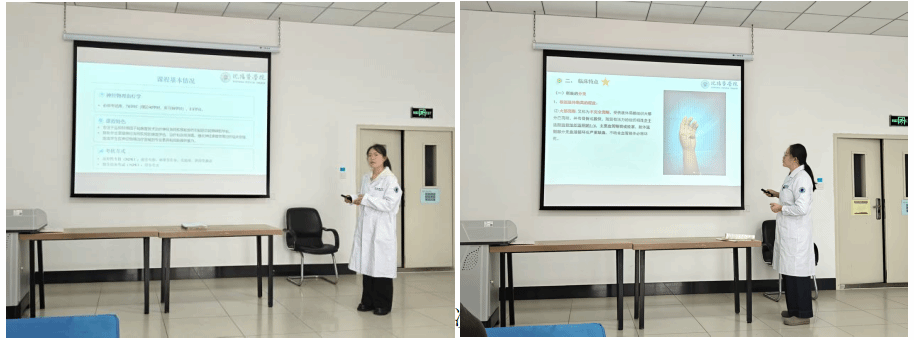 随后进行新员工试讲环节,丛盛日老师和李银花老师分别主讲了《肌肉骨骼的物理治疗》和《神经康复的物理治疗》课程片段。两位新进员工准备充分,教态自然,展现了年轻员工积极向上的精神风貌和扎实的专业功底,试讲效果良好,获得在场员工的一致认可。